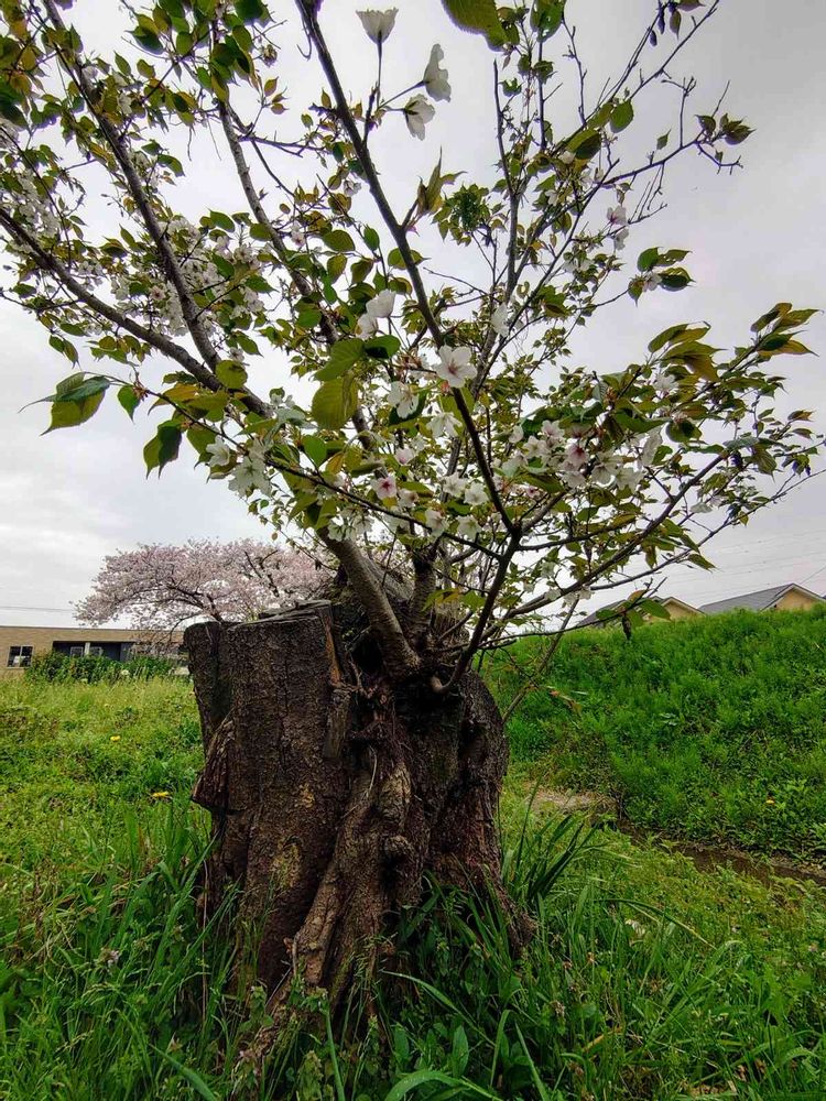 切り株から見るともともと大きな山桜だったみたいですね👀ひこばえ🌱がぐんぐん育ちますように。