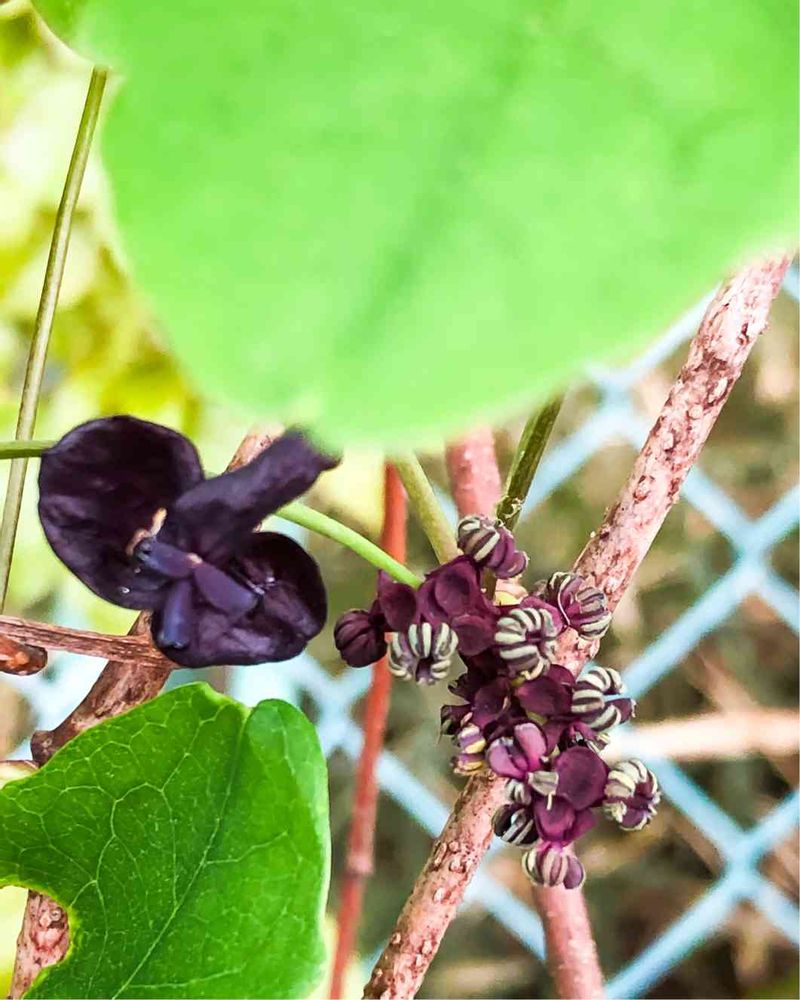 駐車場のフェンスに絡まって咲いていました😊ミツバアケビだと思います。