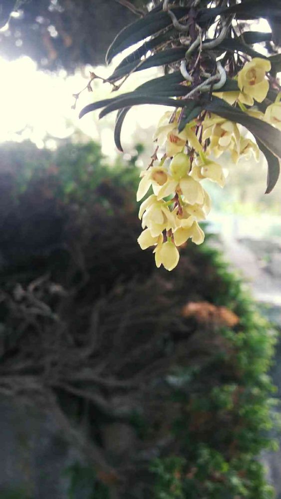 裏庭の松についているカヤランがかいかしました。数ミリの花、とても可愛いです。
