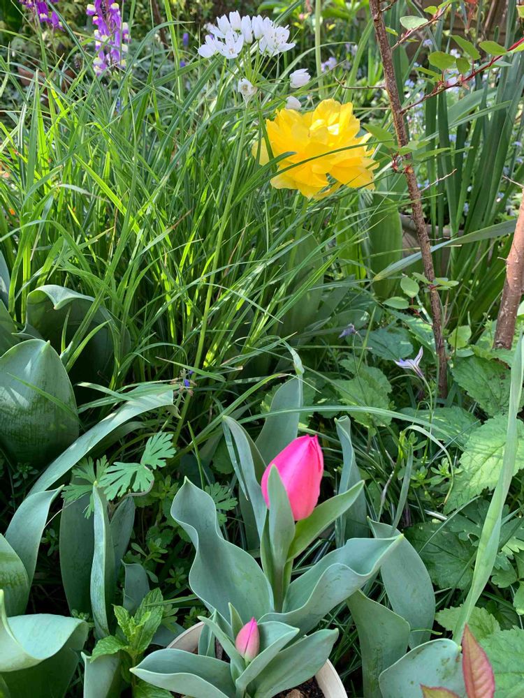埋もれていて 小さな鉢に植え替えたチューリップは、