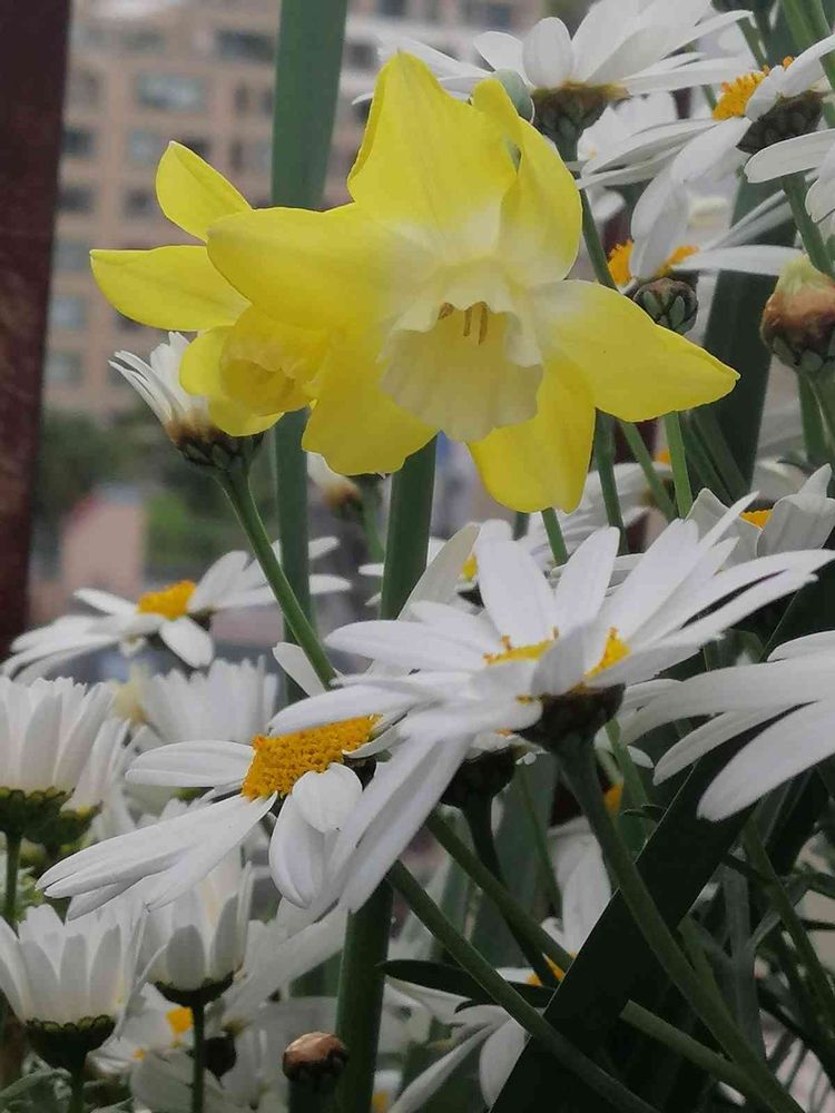 水仙の鉢にノースポールをちょっとお邪魔させたら、モリモリになっちゃって…水仙さん顔を出すのが大変で〜😅
