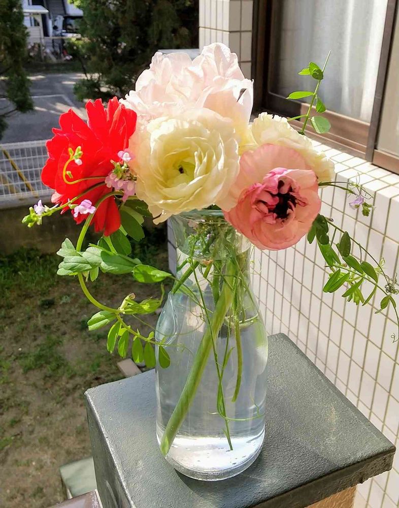 ラナンキュラスとチューリップと庭に生えてたツル性のなにか。心のイガイガも