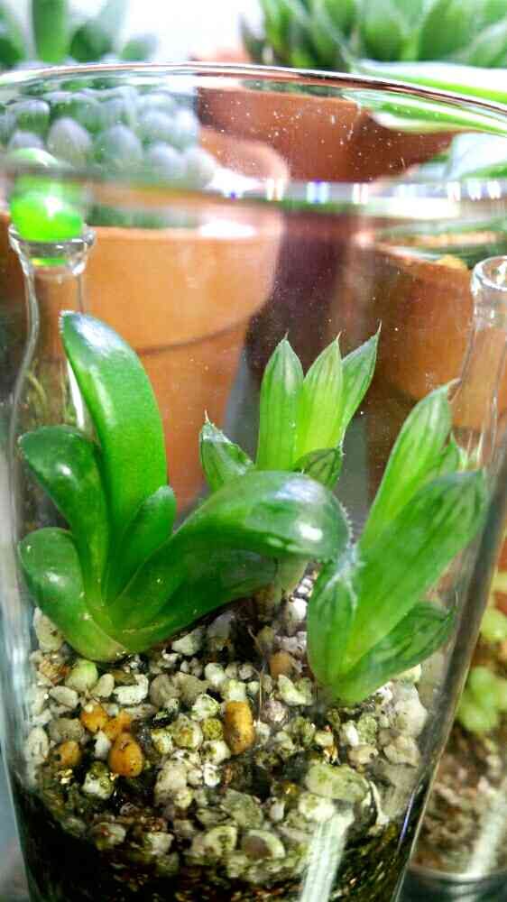 内側のガラスから、水をやります。ガラスの蓋してね。数時間後に内側のガラスの水滴を、綿棒で取ってまた蓋。