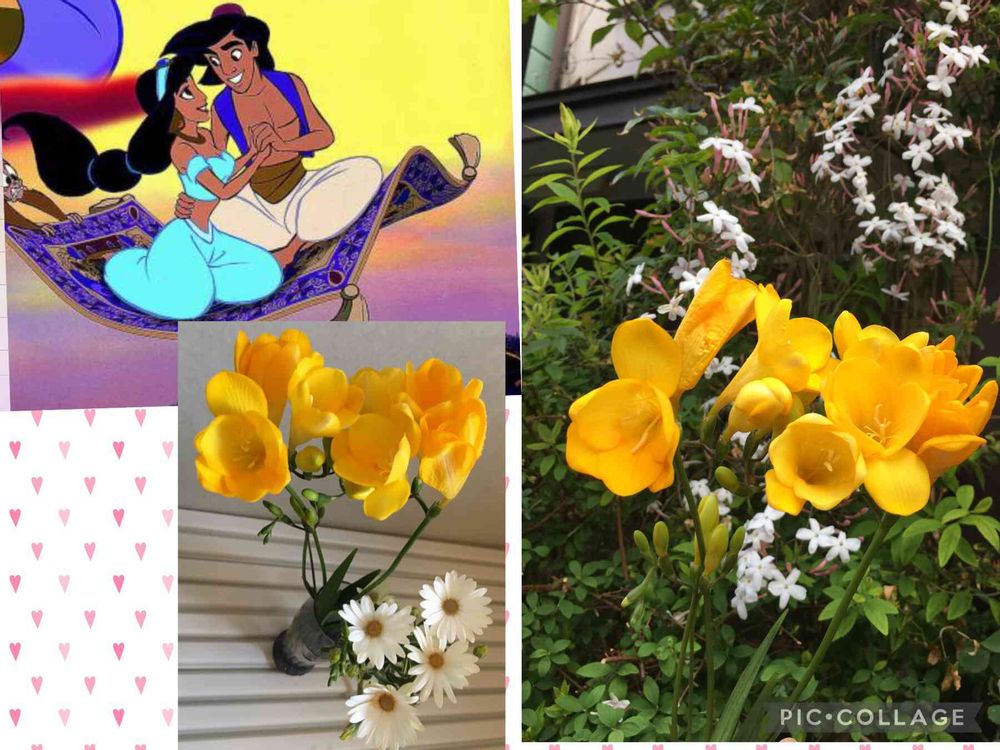 昨日、娘が買ってきた、フリージア。庭にあるジャスミンと一緒に撮って欲しいそうで。なんで?と聞くと、名前がアラジンだからとか。その後、アラジンは、私がウッカリ折ってしまったオステオスペルマムと花瓶に入れました。^o^。