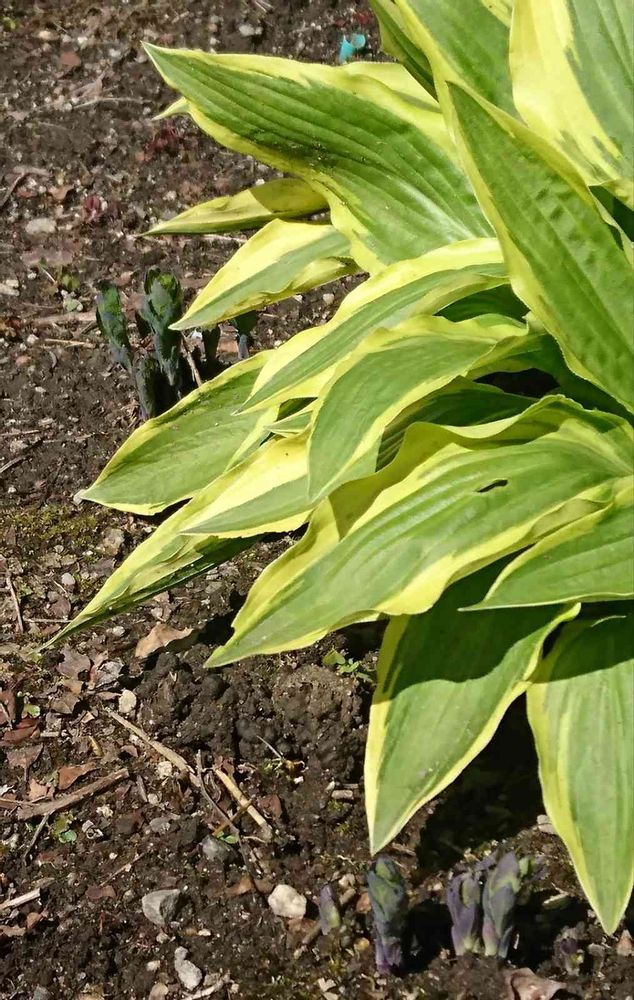 my花壇の ギボウシ(ホスタ)さんと周りに新芽を出した 桔梗(ききょう)さんです😋💕…