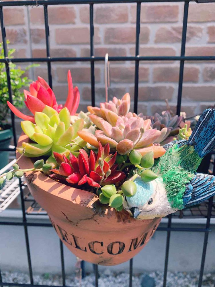 可愛い鉢を見つけたのでほったらかし多肉を寄せました😊小鳥ちゃんのアタマにピーチネックレスが🤣