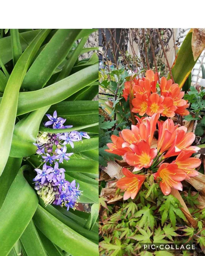 君子蘭と オオツルボ? 色鮮やかに