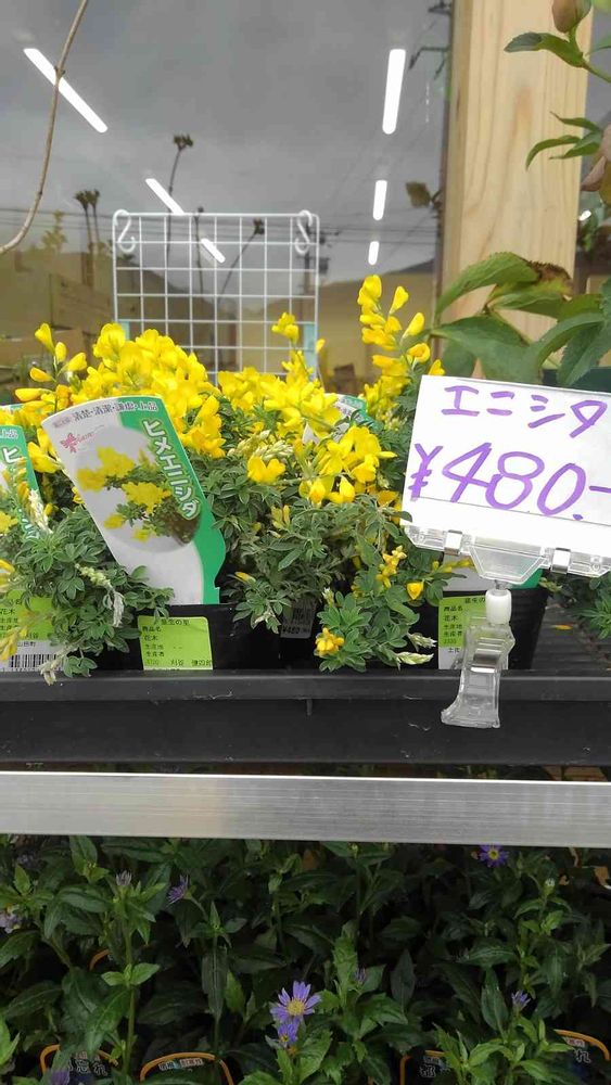 花卉販売の棚、卸売りさんは本来の名にすべきと タグも新調した。にも拘わらず、小売りさんは馴染みの無い名前では売れないと 手書きでエニシダの名札を立てた。