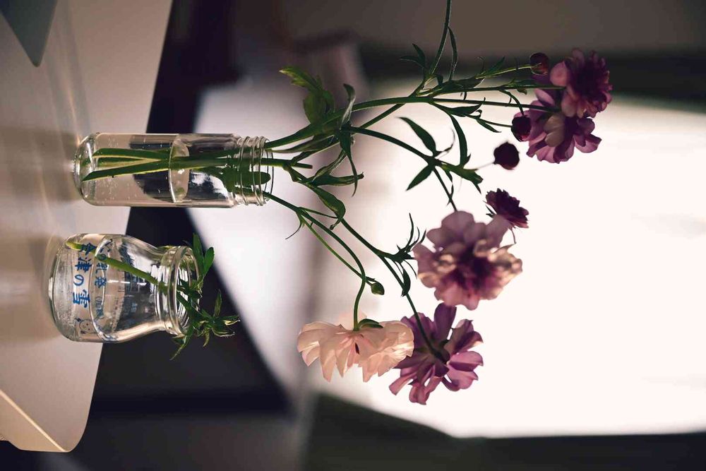 間違って切ってしまった蕾付きの枝は、お気に入りのヨーグルトの瓶に刺しています。