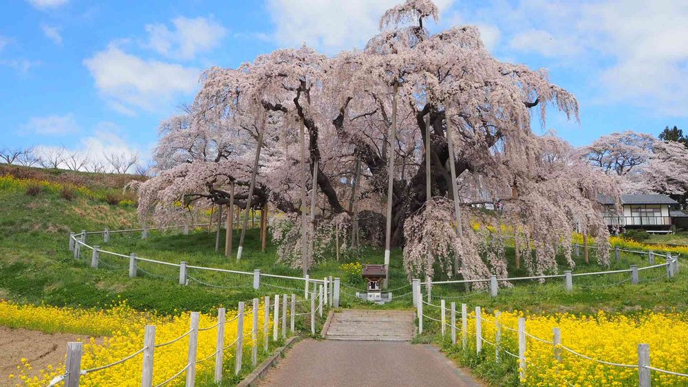 樹齢約1000年 樹高12m 日本三大桜のひとつ、樹種はベニシダレサクラです!