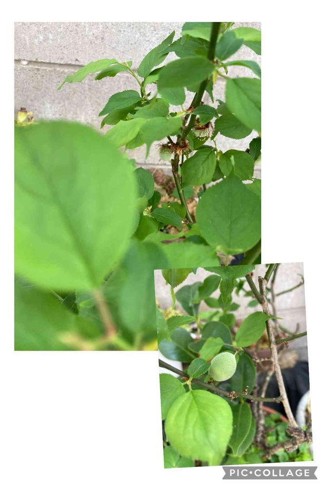 ユスラウメの実でしょうか。ちっちゃいのがついてました。奥にも花のあと実ができかけています。