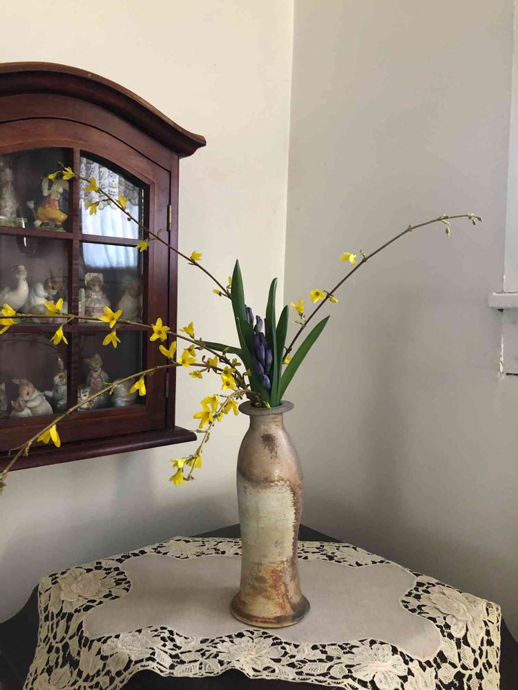 黄色いレンギョウと青の濃いヒヤシンスの取り合わせ、先生は色彩学を示して下さっている、と思いながら鑑賞しました。