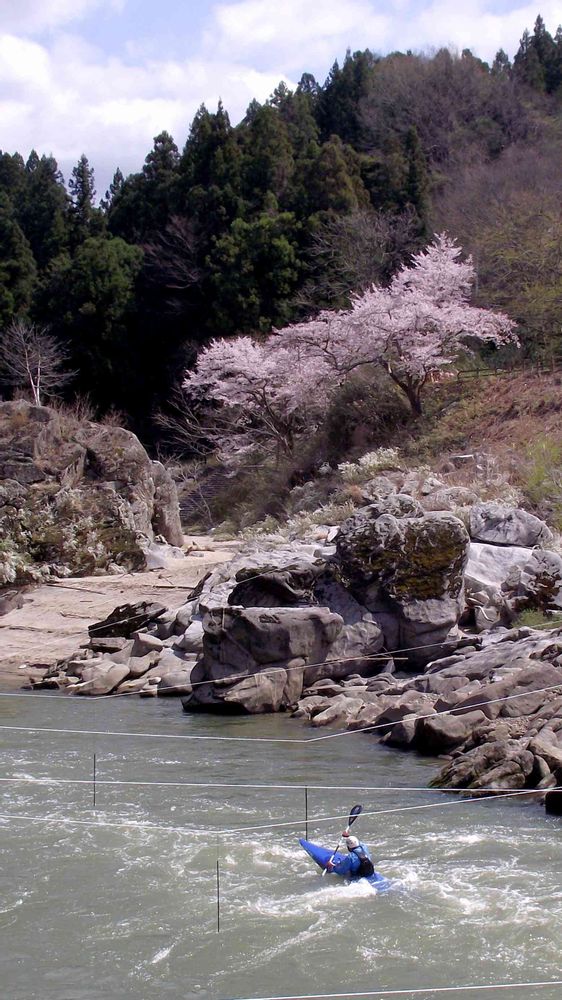 満開の桜をバックにカヌー競技の練習