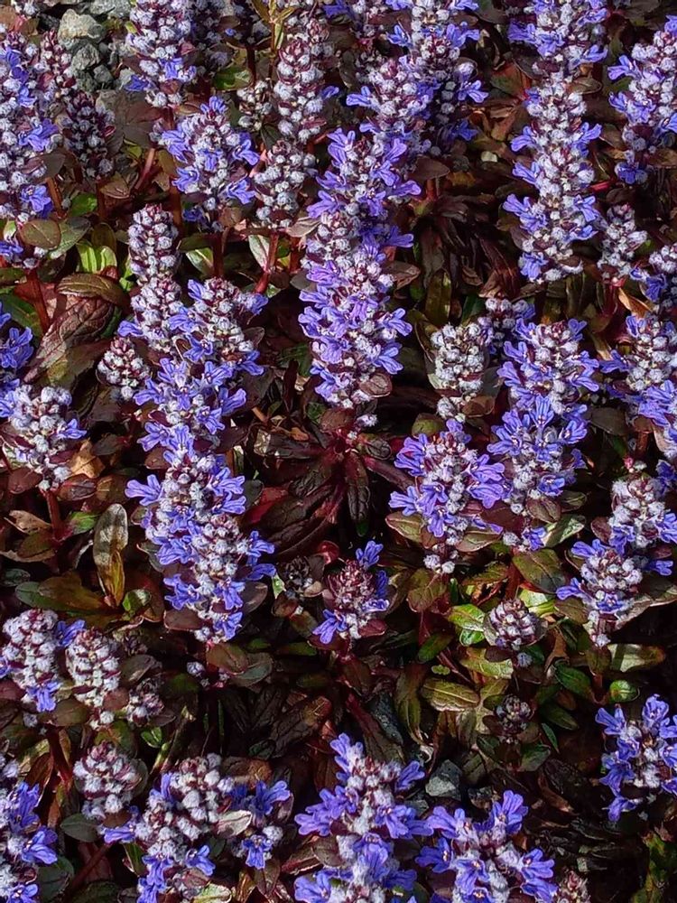 駐車場の砂利場に植わるアシュガが咲き出しました♪