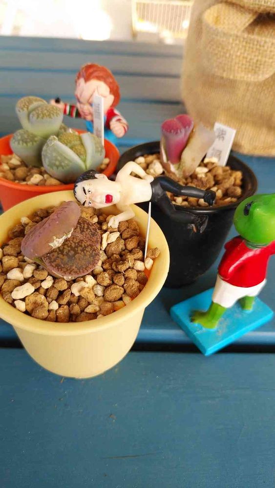 我が家のリトープス君達の脱皮が始まりました、みんな真ん中から割れてるのに手前の子は横から割れてフタを開けたみたいになってるぞ🤣