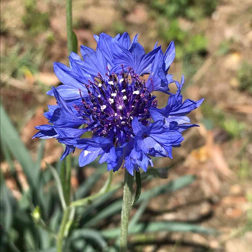 青い子は矢車草だよ、オリちゃんパパ👨さんが知ってるはず。どこかのお家から種が飛んできたんだね