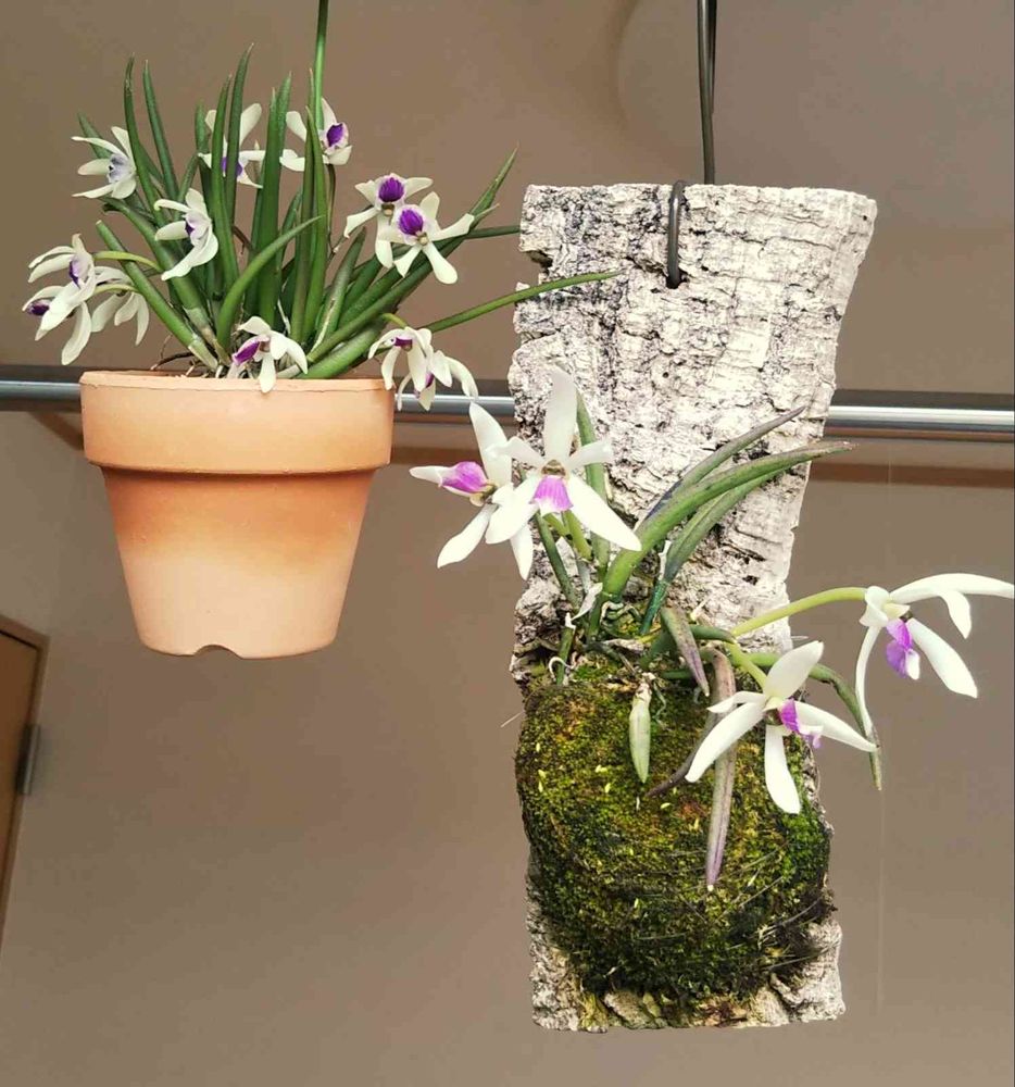 花を見比べてみた。レプトテスビカラージュン右の方が花が大きい。左の交配種は紫が濃く香りがする。素焼鉢が新品なのは引っ掛けそこなって落下、割れた為😔苔が生えた鉢の方が好きかも🙄