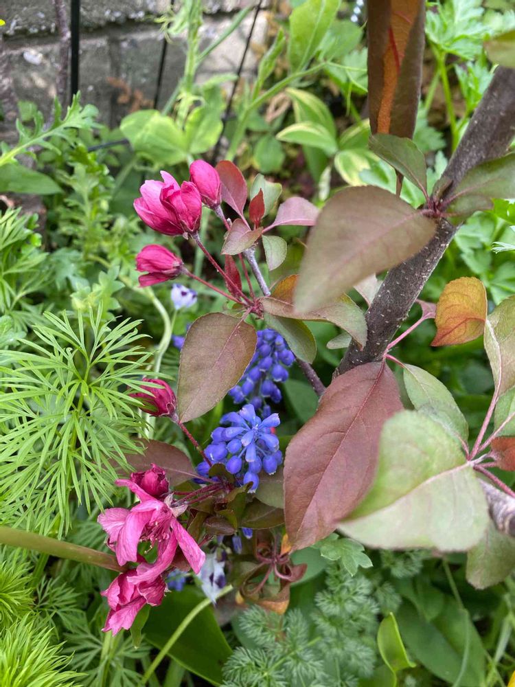 ムスカリが邪魔してますが…2年目でやっと咲いたクラブアップル