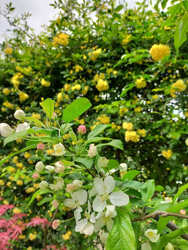 ゆかりんさんの小さな庭,黄モッコウバラ,クラブアップル(ヒメリンゴ)の投稿画像