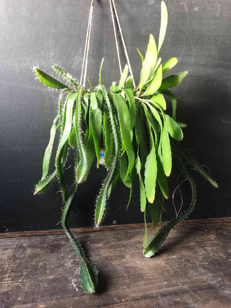 リプサリスmixを蒔いたらこんな感じになりました。これもペットボトルです。ドラゴンフルーツそっくりのやつも混ざっています。ヒゲのような気根がスゴいです。鉢底から根がでています。植え替えたいけど植え替えたくない(._.)