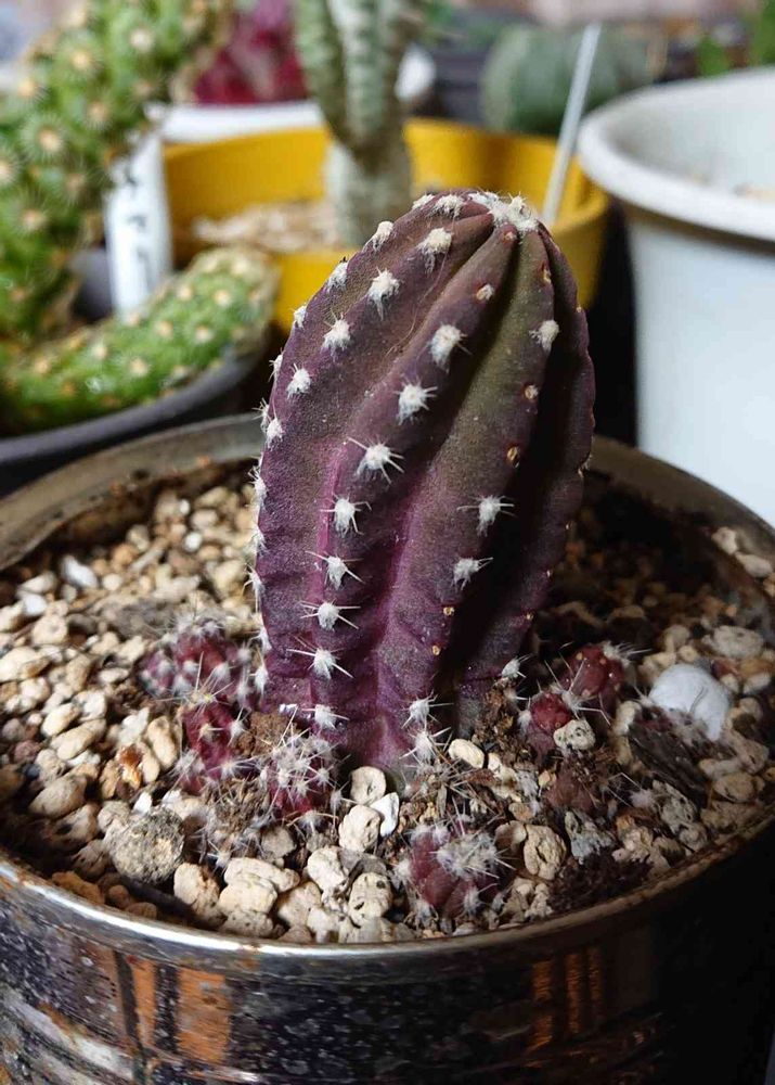 去年11月に迎えた時の画像を見たら、上半分が緑、下はやや紫でした。冬は室内管理、結構寒い部屋で、日中は半日位明るい感じでした。最近は外で日向ぼっこさせ夜は室内です。タコのようですよね。可愛いからこのまま紫でもいいかな‥😆