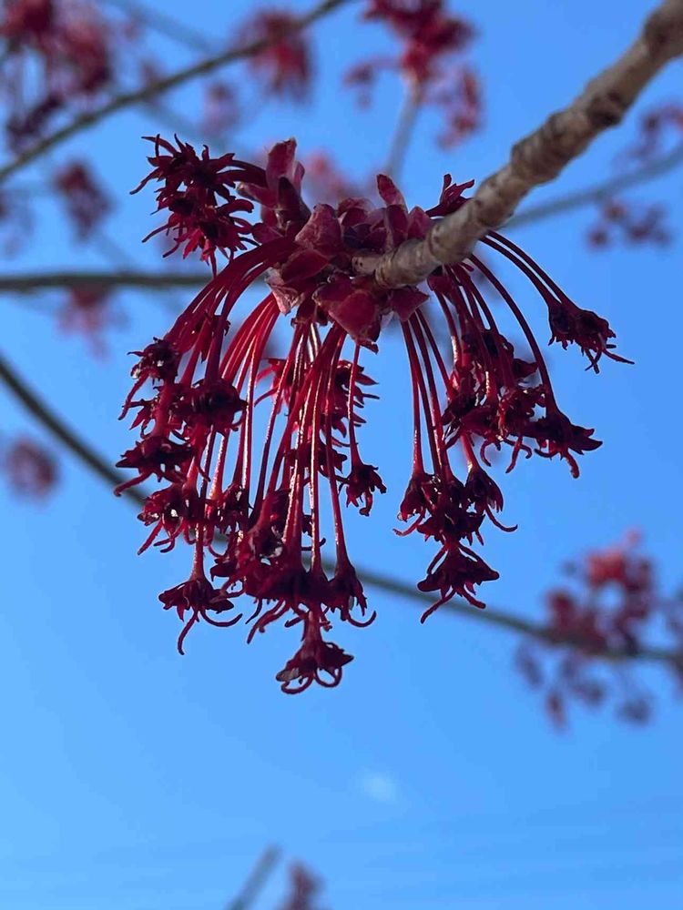 雌雄異株で、これは雌花。葉が出る前に開花するので、あざやかな真紅が際立ち、目を惹かれる。花の茎を伸ばして咲くのが雌花で、優雅。黒っぽいプロペラ状の種が見えている。雄花は枝から直接咲く。