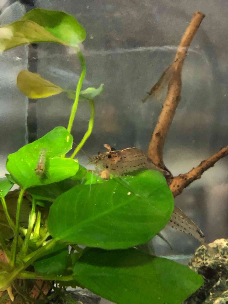 エビさんがごはん抱えてる姿かわいいです。うちのエビさんは抱えたまま葉っぱから落ちて水槽の底に着地したりしてます(^^;)