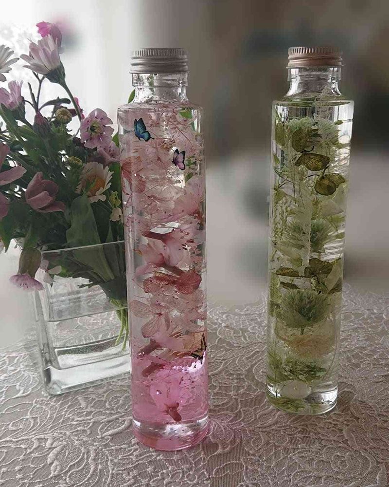 下の方にピンク色の混ざらない(比重の重い)ハーバリウムオイル入れたり、キラキラの粉みたいなのを入れて、