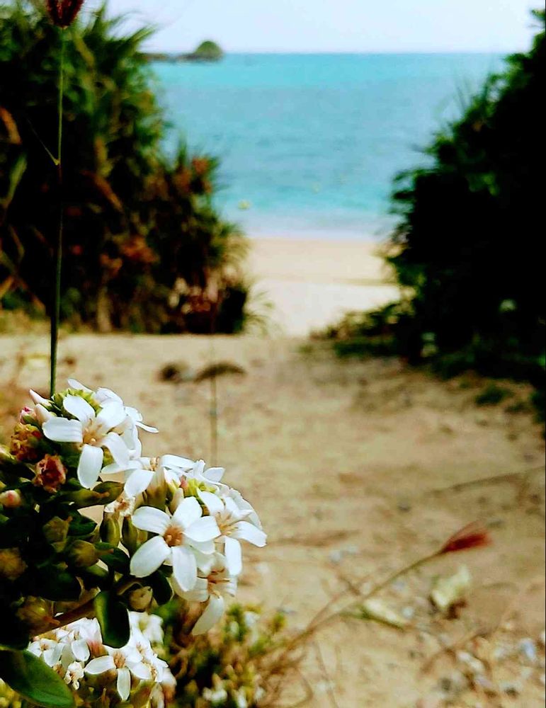 お花の向こうに砂浜、海、いいですねぇ❤️ため息ものです。
