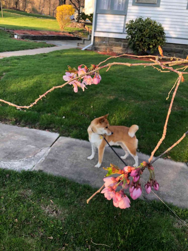 チェリーストリートという短い通りがあり、八重桜が咲き始めました。サスケパトロール隊長久々に我が家の敷地を離れました🤣