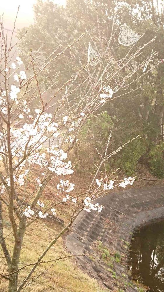 クモの巣と桜...霧に濡れたクモの巣がキラキラ光って綺麗でした♪