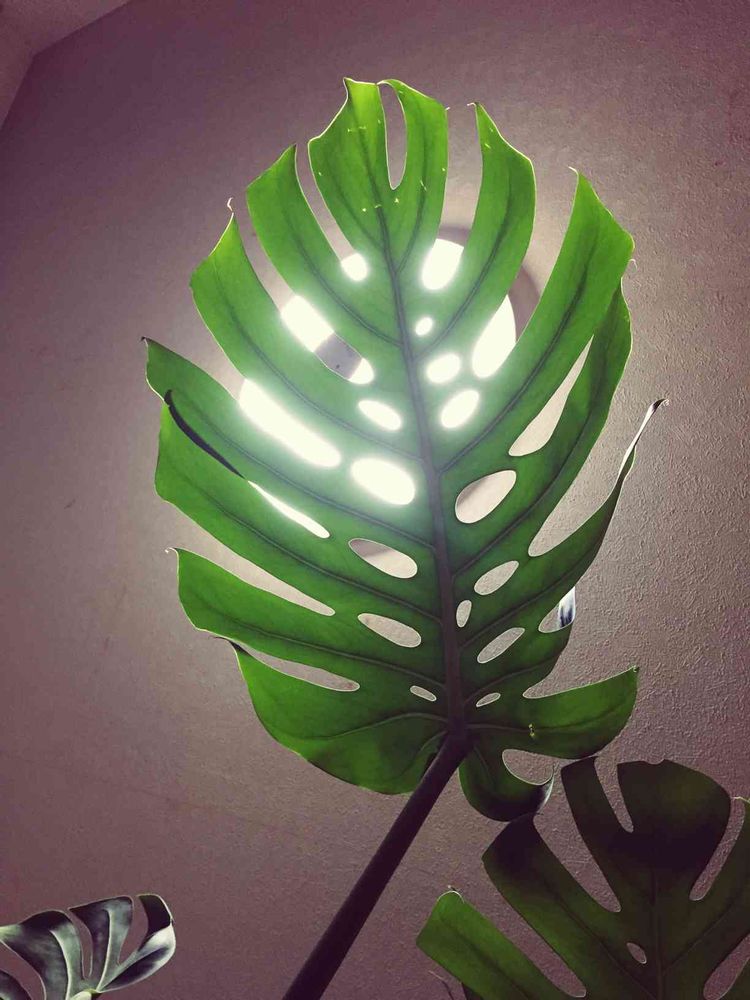 リビングに寝転がって見たら‥‥モンステラの🍀葉の間からの明かり(笑)