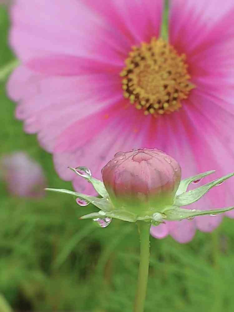 蕾を撮っていたら、後から見守るコスモスに気付きました。 ( ⁎ᵕᴗᵕ⁎ )