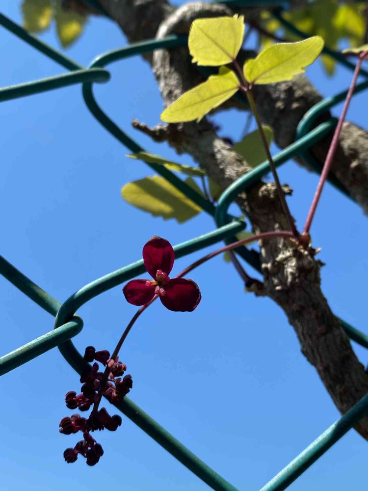 青空に映えるミツバアケビの花