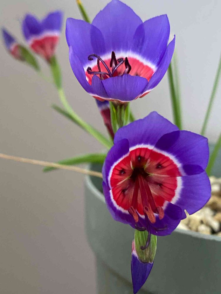 昨年から植えっぱなしで夏休眠しておいたゲイソリザが6輪花がつきました。花持ちが2日くらいしか持たないので、儚いワインカップみたいな花を楽しみます☺︎