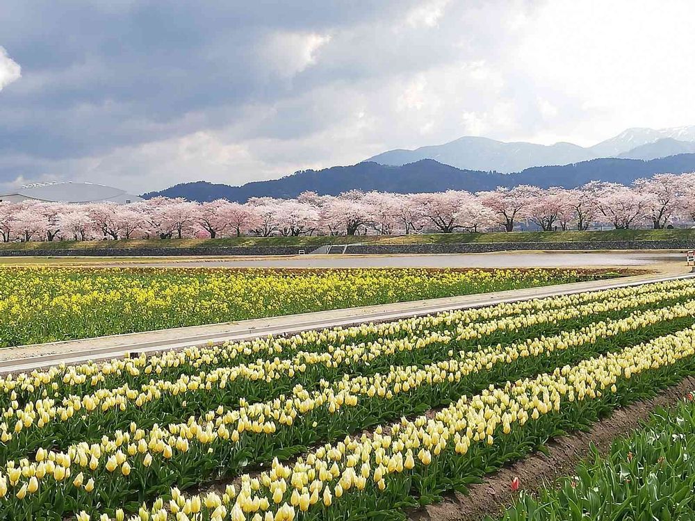 欲を言うと、もう少し空の雲が無いと白い山並がくっきりと🏔。 🌸桜が早かったそうで 🌷チューリップとの足並みが揃わず…💦 もっといろんな色合いのチューリップ🌷🌷🌷が入ると良かったかな〜なんて。 思い立って走った🚘💨割には まだ恵まれた方だと思わないとですね🌥😉💕