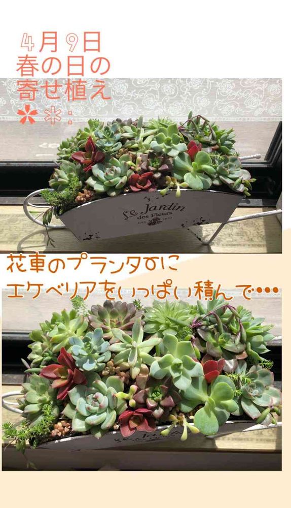一般的な花の寄せ植えだと隙間なく土見えなくとギューギューに入れるけど、多肉ちゃんでやるのでいつもカオスな寄せ植えになってしまうんですねー( ´д`)💨