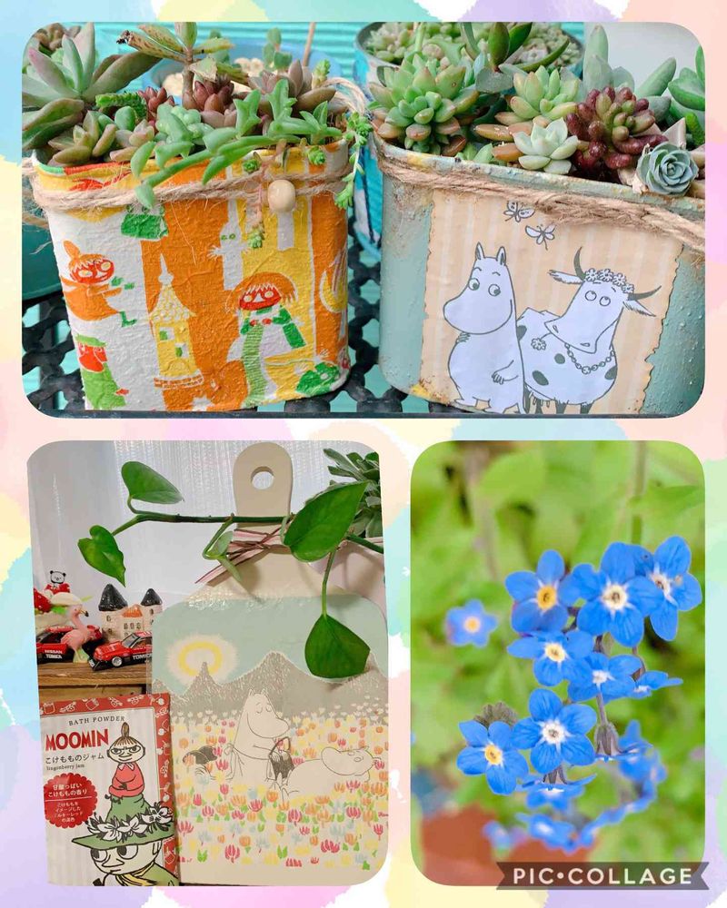 ムーミン缶めっちゃかわいいから毎日眺めていたんですが…せっかくのムーミンの日に合わせて寄せ植えしました⸜(*ˊᗜˋ*)⸝
