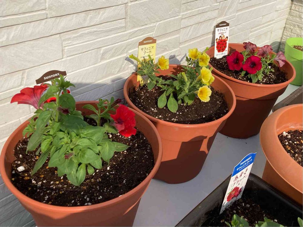 サフィニアのJapanレッドとシャインレッド、同じレッドでもそれぞれどんな風に育つかなぁʕʘ‿ʘʔ