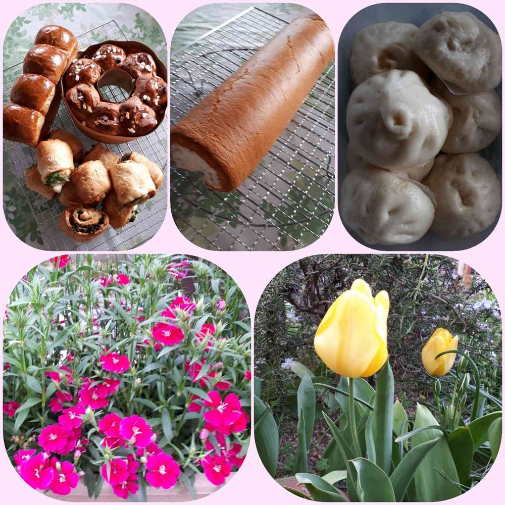 美味しそうなパンとロールケーキですね、花より団子!甘党でして。