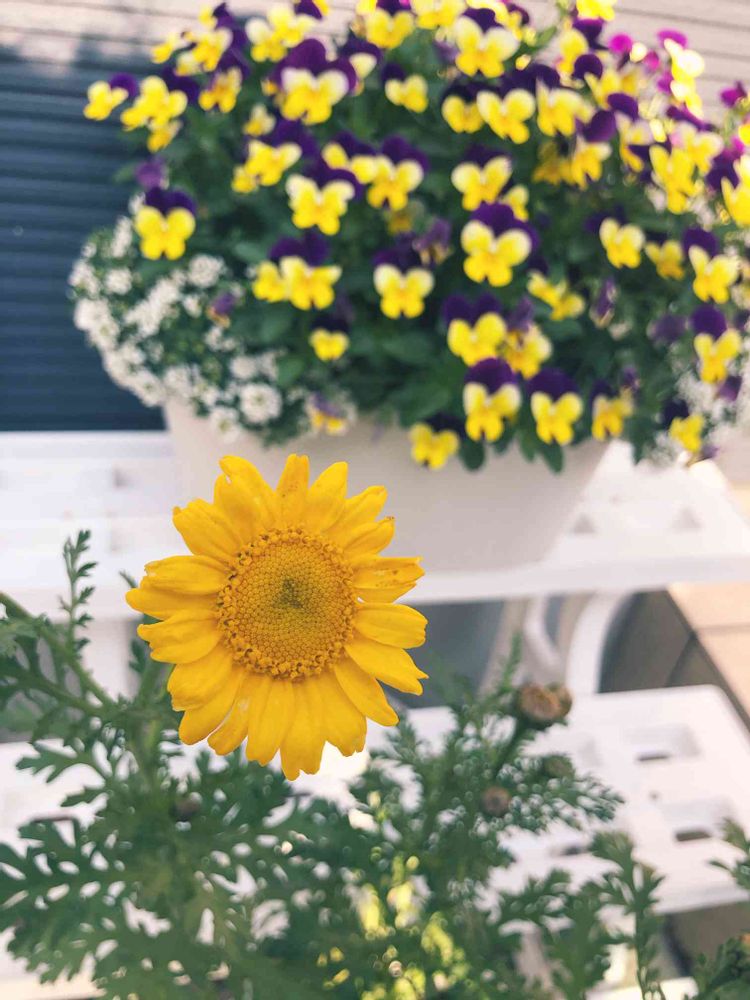 観賞用に育てていた春菊の花が咲きました🌼その後ろにはビオラとホワイトアリッサムの寄植え…なの?しばらく美容院に行っていない人に見えてきました😂