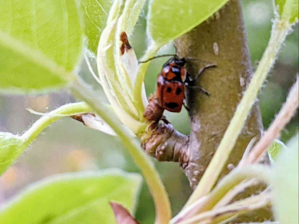 たぶん天道虫の友達のクロホシツツハムシかも。私はなかなか出会えない昆虫です。