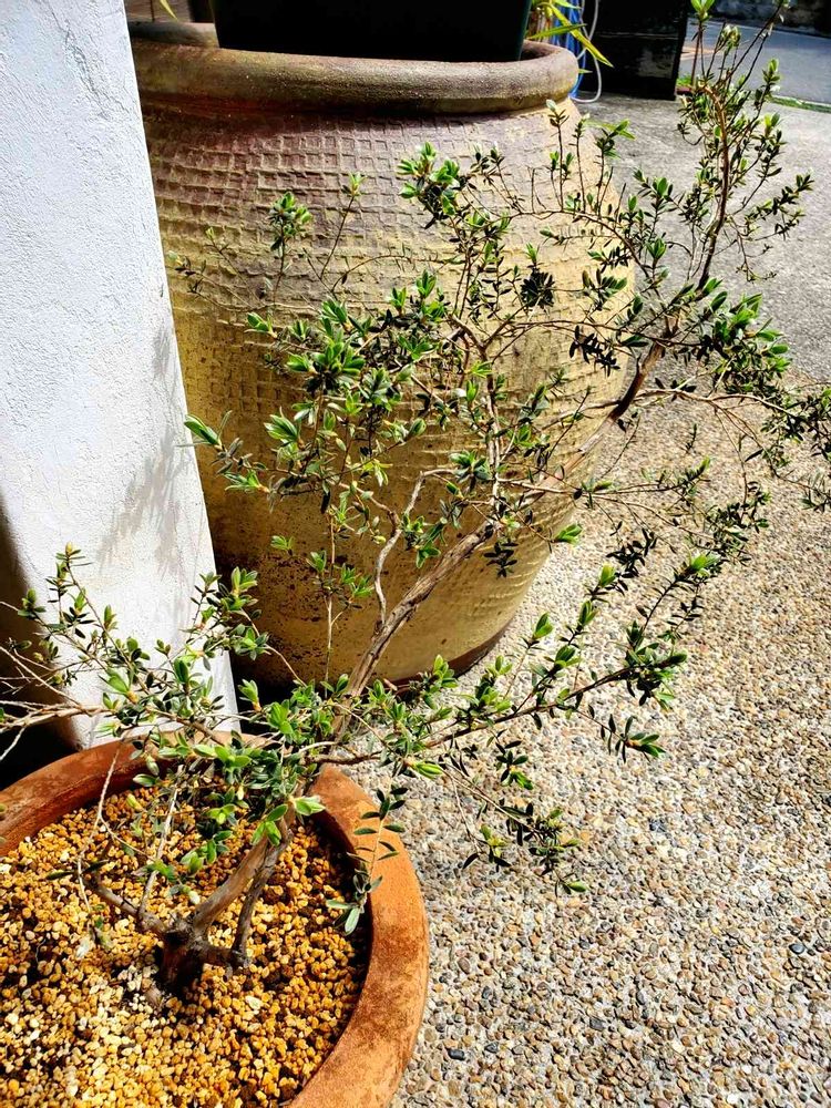 ザ ファーム ユニバーサル茨木で購入したフトモモ科レプトスペルマム属ウィルソンズホワイトティーツリー、結局シンプルな40cmの浅鉢に植え替えて、お店の玄関に置きました。
