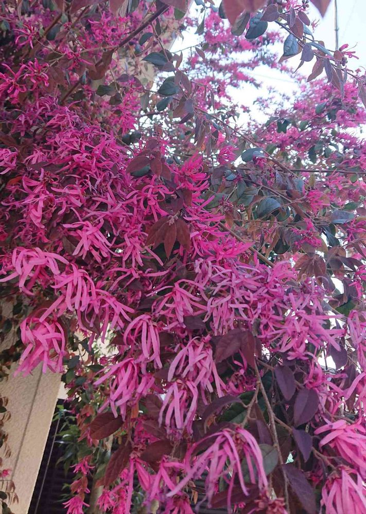 散歩中 足元に沢山の花びら〰️濃いピンク💗💗💗