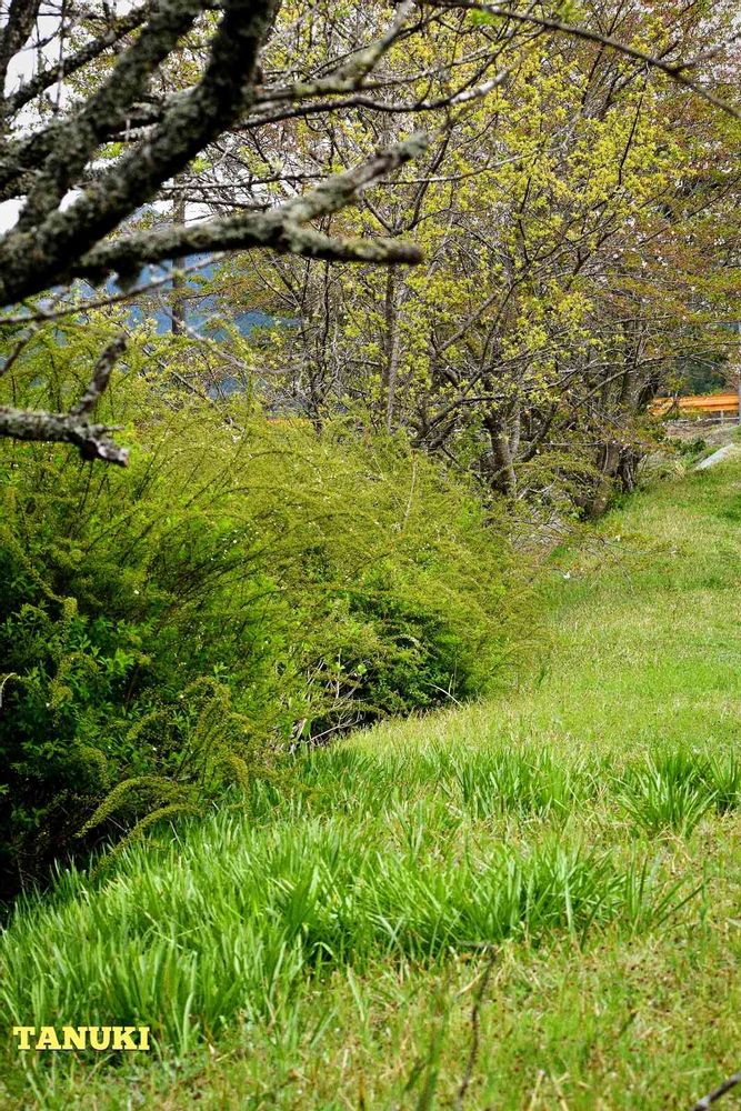 ユキヤナギの花が終わり、桜も終わって土手の木々には新葉が芽吹いてきています。