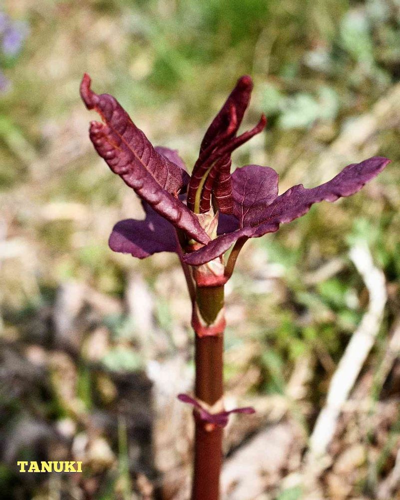 円柱形の若い茎は、紅紫色の斑点が有るタケノコ状で、先端に赤い若葉が付きます。