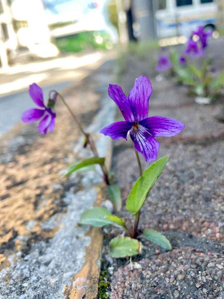 歩道のブロックの合間から生えてきたど根性すみれさん。