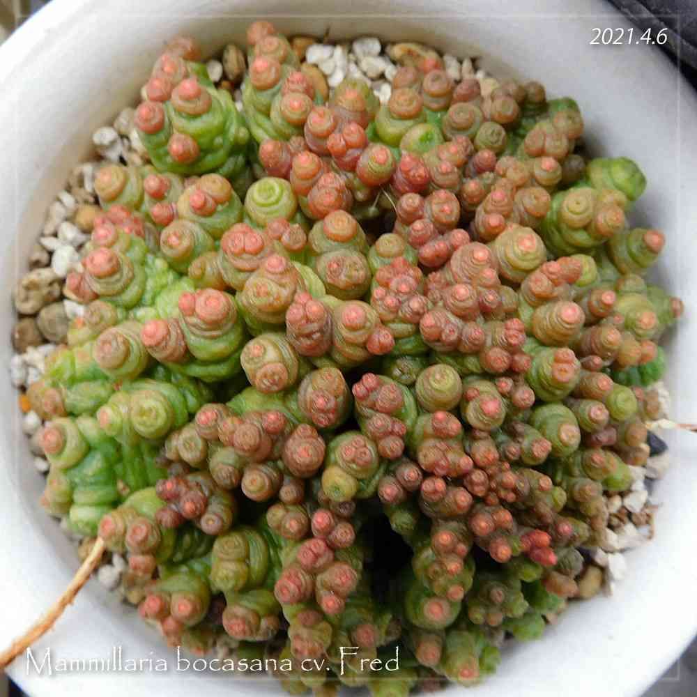 さん サボテンです。マミラリア属という、本来はイボイボが特徴のサボテンですが、突然変異の品種でこんなイモムシみたいになってます。