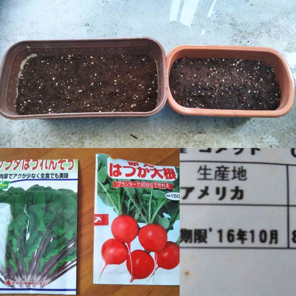 昨年に続きサラダほうれん草とはつか大根。はつか大根の種は期限から5年経過のもの