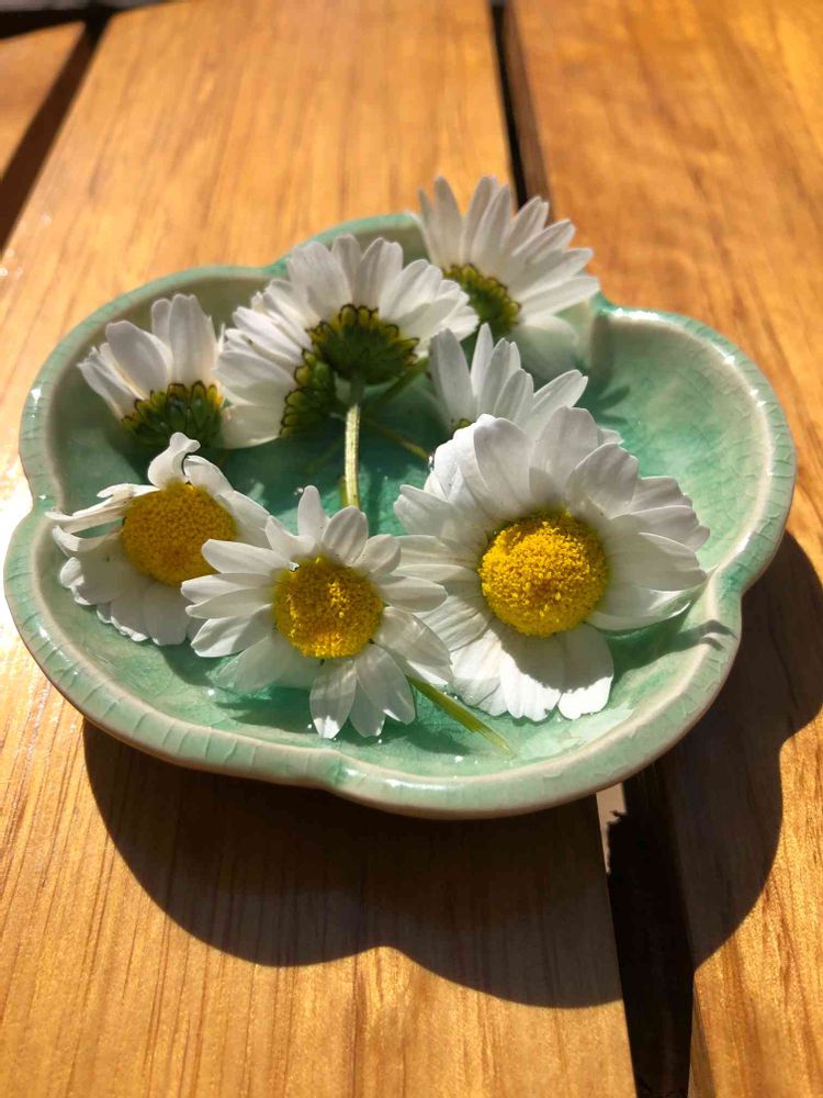 デッキで、お花と一緒に日向ぼっこ…眠くなる〜🥱お花は、おチビさんが庭から摘んできたので。